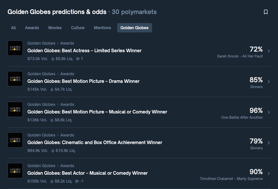 골든 글로브 주최 측은 최근 폴리마켓과의 협력을 통해 시상식 관련 주요 부문 수상자에 대한 예측 확률을 방송과 디지털 플랫폼에 제공할 계획이라고 밝혔다. 폴리마켓은 이용자들이 실제 자금을 걸고 정치·경제·문화 등 다양한 사건의 결과를 예측하는 온라인 플랫폼이다.