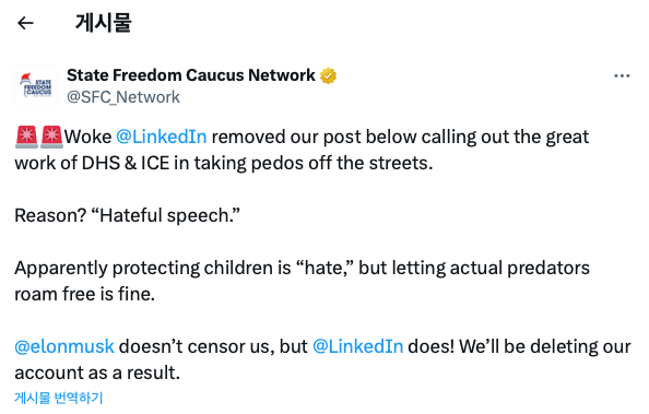 ▲링크드인이 불법 이민 단속을 옹호하는 게시물을 ‘혐오 콘텐츠’로 분류해 삭제했다.(사진=자유협의회네트워크 X)