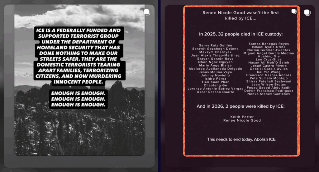 당시 ICE 요원의 총격으로 단속 작전을 감시하던 자원봉사자 르네 굿이 숨졌고, 이를 둘러싼 논란이 확산되며 미 전역에서 항의 시위가 이어졌다.
